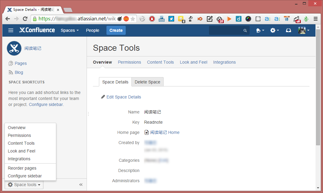 空空间管理包括对空间的配置、删除、权限等等一系列的管理。在页面左下方的【Space tools】即可进入空间管理操作。